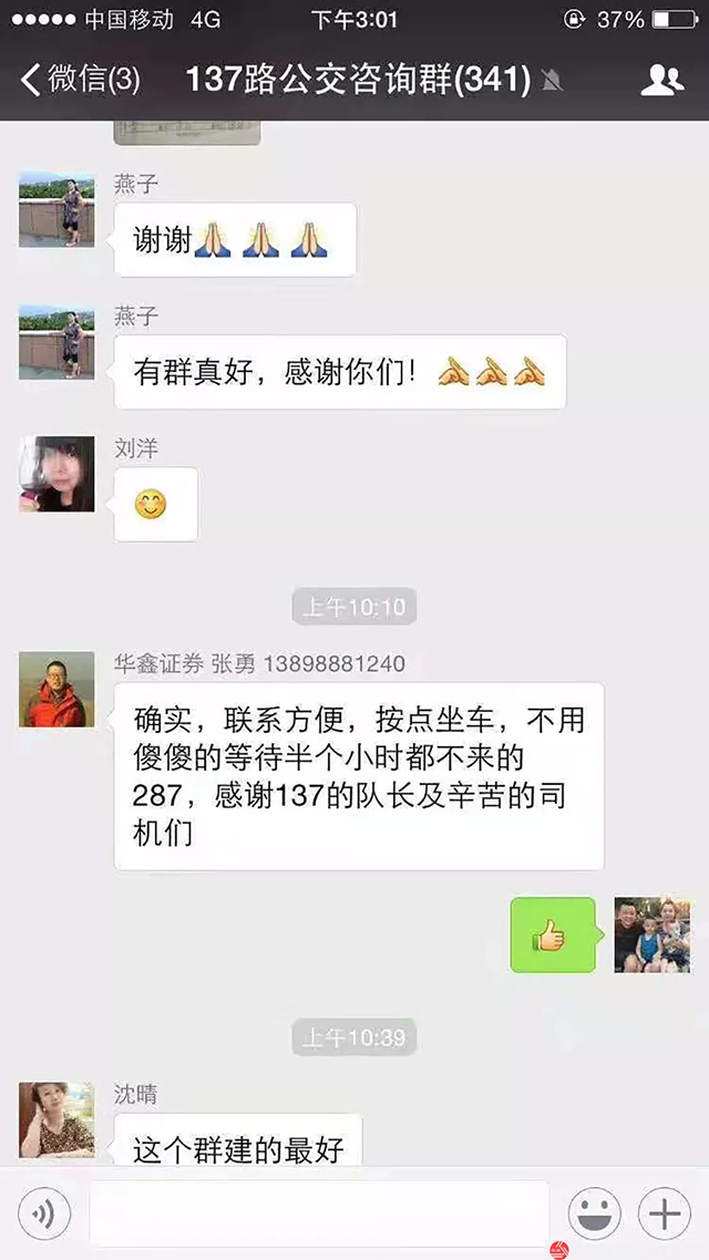 沈蘇公司137路車隊(duì)于2017年年底創(chuàng)新性的建立了137路車隊(duì)公交咨詢?nèi)海鸪踝稍內(nèi)褐挥卸怀丝?,三個(gè)月后,137路車隊(duì)咨詢?nèi)阂呀?jīng)達(dá)到了350人左右。咨詢?nèi)旱慕?,方便了乘客與車隊(duì)之間的溝通,車隔時(shí)間的變化車隊(duì)會(huì)在咨詢?nèi)褐械谝粫r(shí)間發(fā)出通知,使乘客出行更加便捷與高效。