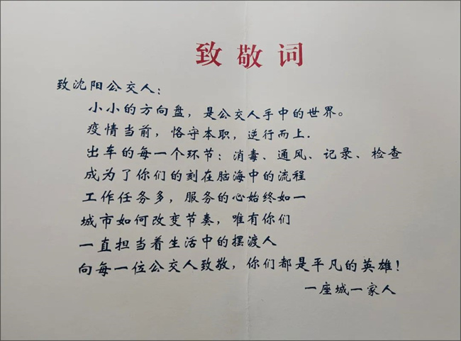 沈陽家書致敬信致敬詞這樣寫著:沈陽公交人小小的方向盤是公交人手中的世界,疫情當(dāng)前,恪守本職,逆行而上。出車前的每一個(gè)環(huán)節(jié),消毒通風(fēng)記錄檢查,成為了你們刻在腦海中的流程,工作任務(wù)雖然多,但服務(wù)乘客的心始終如一。不管城市如何改變節(jié)奏,唯有你們一直擔(dān)當(dāng)著生活中的擺渡人,向每一位公交人致敬!你們都是平凡的英雄!