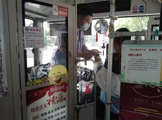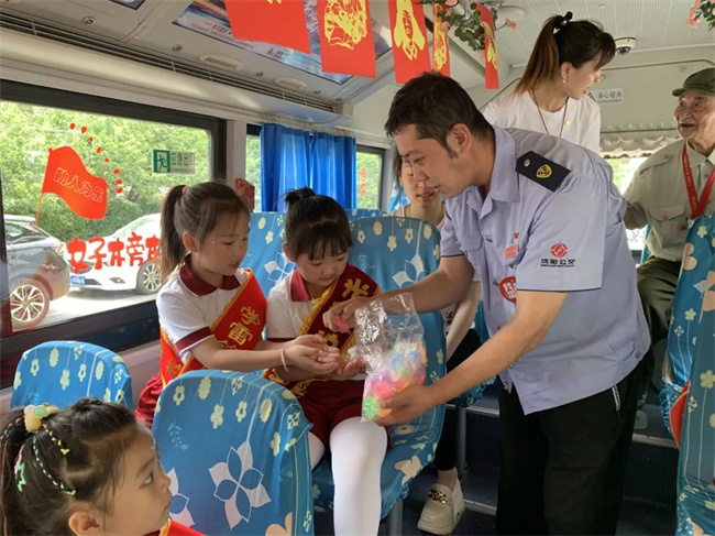 6月1日一大早,繆立眾駕駛著這輛滿載著小禮物和卡通元素的公交車準(zhǔn)時(shí)發(fā)車。一名女乘客帶著小朋友剛一上車,繆立眾的小禮物便送到了小朋友面前。