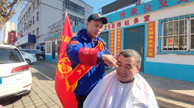 通利、康龍公司258路車隊的職工們化身志愿者為外地乘客進行路線引導(dǎo)咨詢、景點游覽解說,來到公交車站附近維持秩序、清潔環(huán)境、擺放共享單車,并為環(huán)衛(wèi)工人免費理發(fā)。