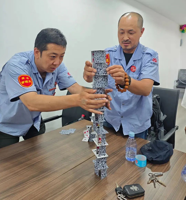 活動伊始,老師將參加活動的19名職工分成了三組,大家在老師的指導(dǎo)下進行了切土豆、馬蓮花開等互動游戲,現(xiàn)場氣氛迅速活躍起來。隨后,通過撲克擺放、卡牌等游戲,讓大家逐漸了解自己和隊友的性格特點、興趣愛好以及潛在的心理需求,為后續(xù)的團隊協(xié)作打下了良好的基礎(chǔ)。
