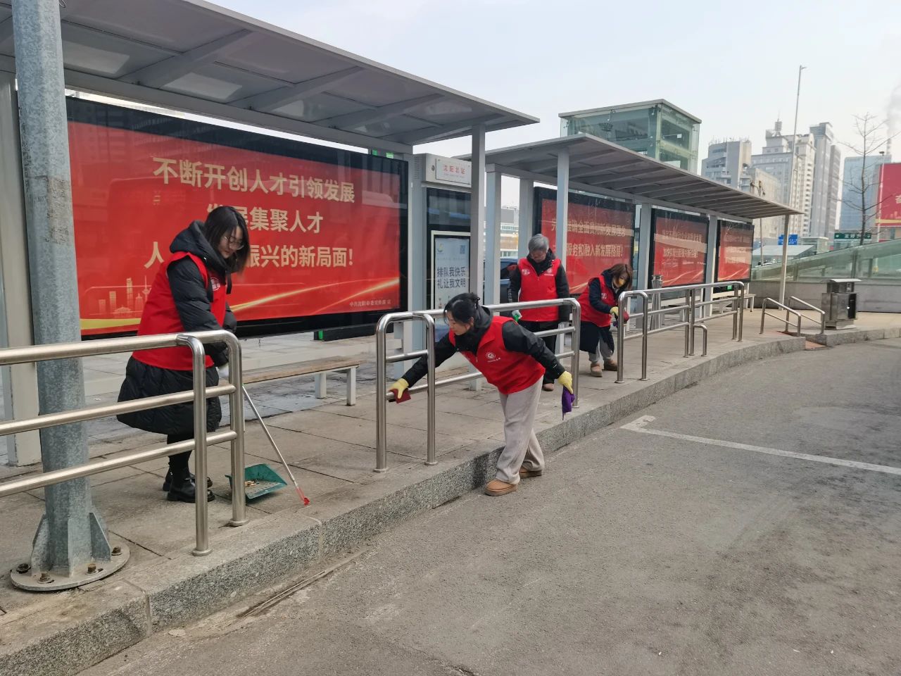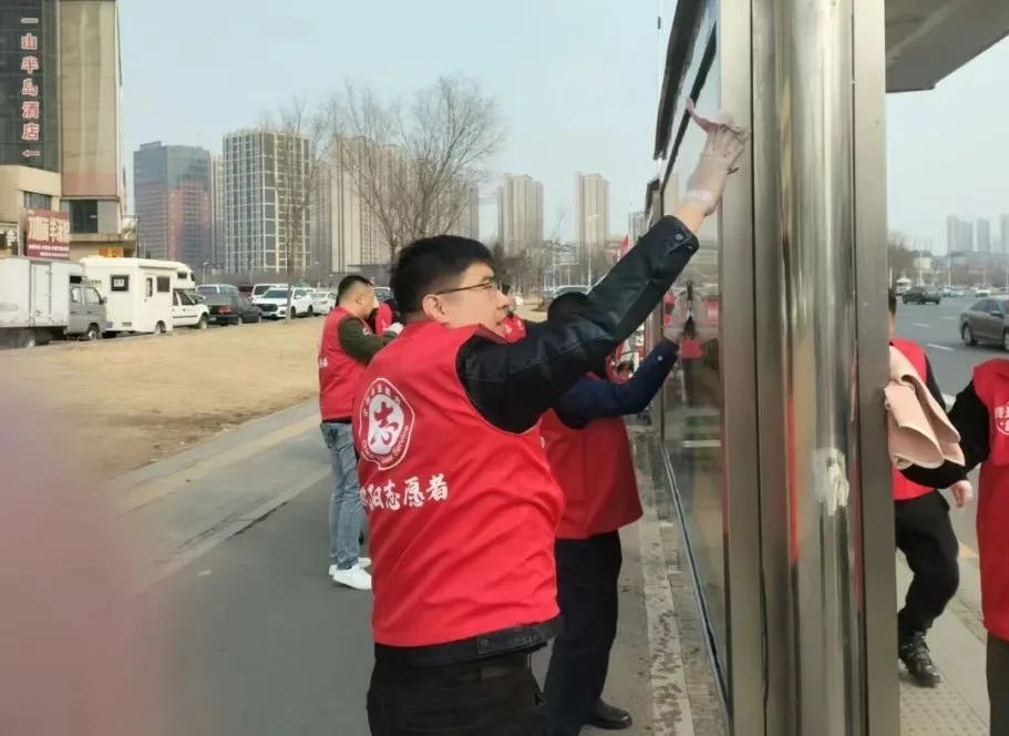 在北站公交樞紐站,志愿者們認(rèn)真清掃公交樞紐站內(nèi)的垃圾、擦拭公交候車?yán)纫约芭抨犠o(hù)欄,不放過任何一個衛(wèi)生死角,為乘客們營造了一個整潔舒適的候車環(huán)境。